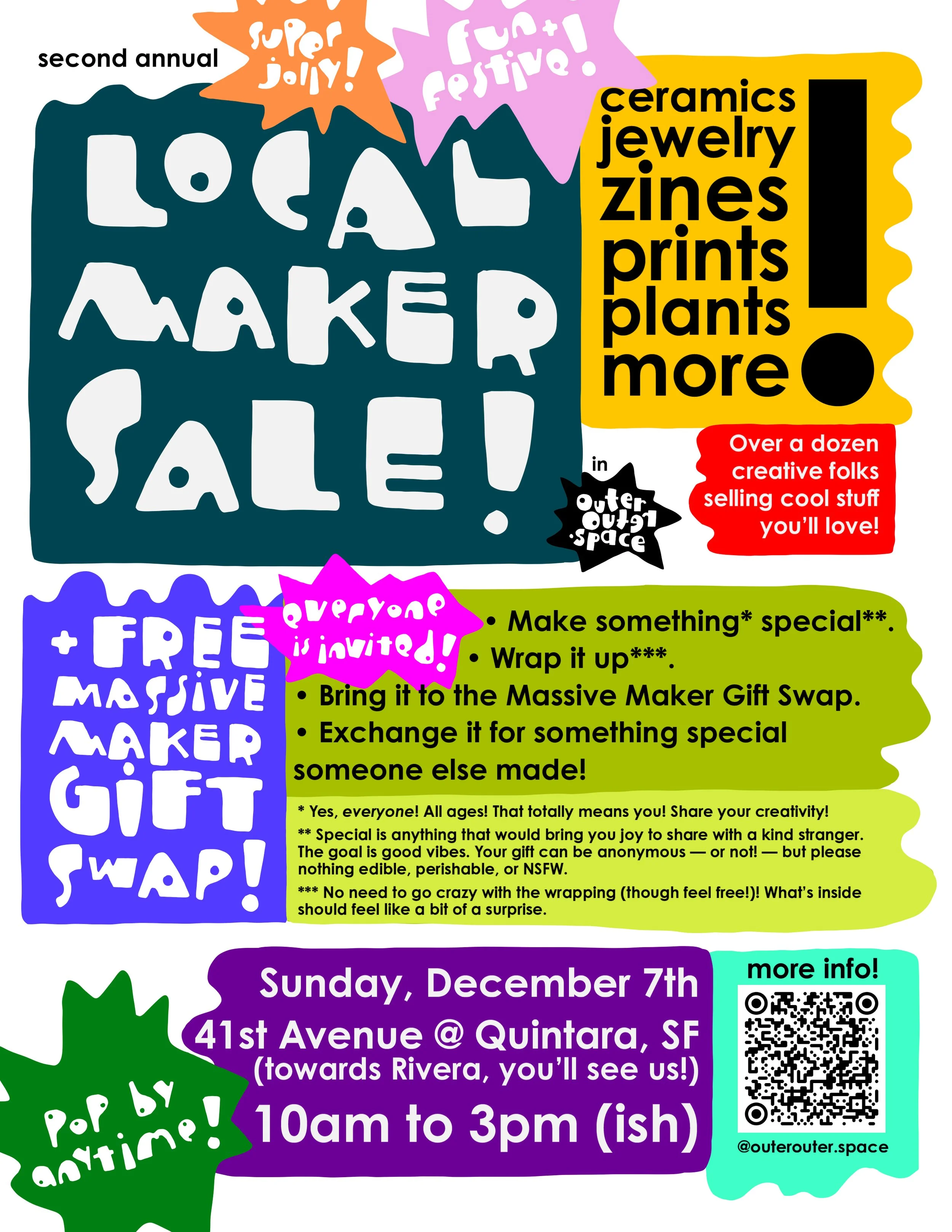 We’re back, baby! Our second annual Super Jolly! Fun and Festive! Local Maker Sale! will be taking place Sunday, December 7th, from 10a to 3p(ish). Head to 41st at Quintara (towards Rivera) and you’ll see us there!