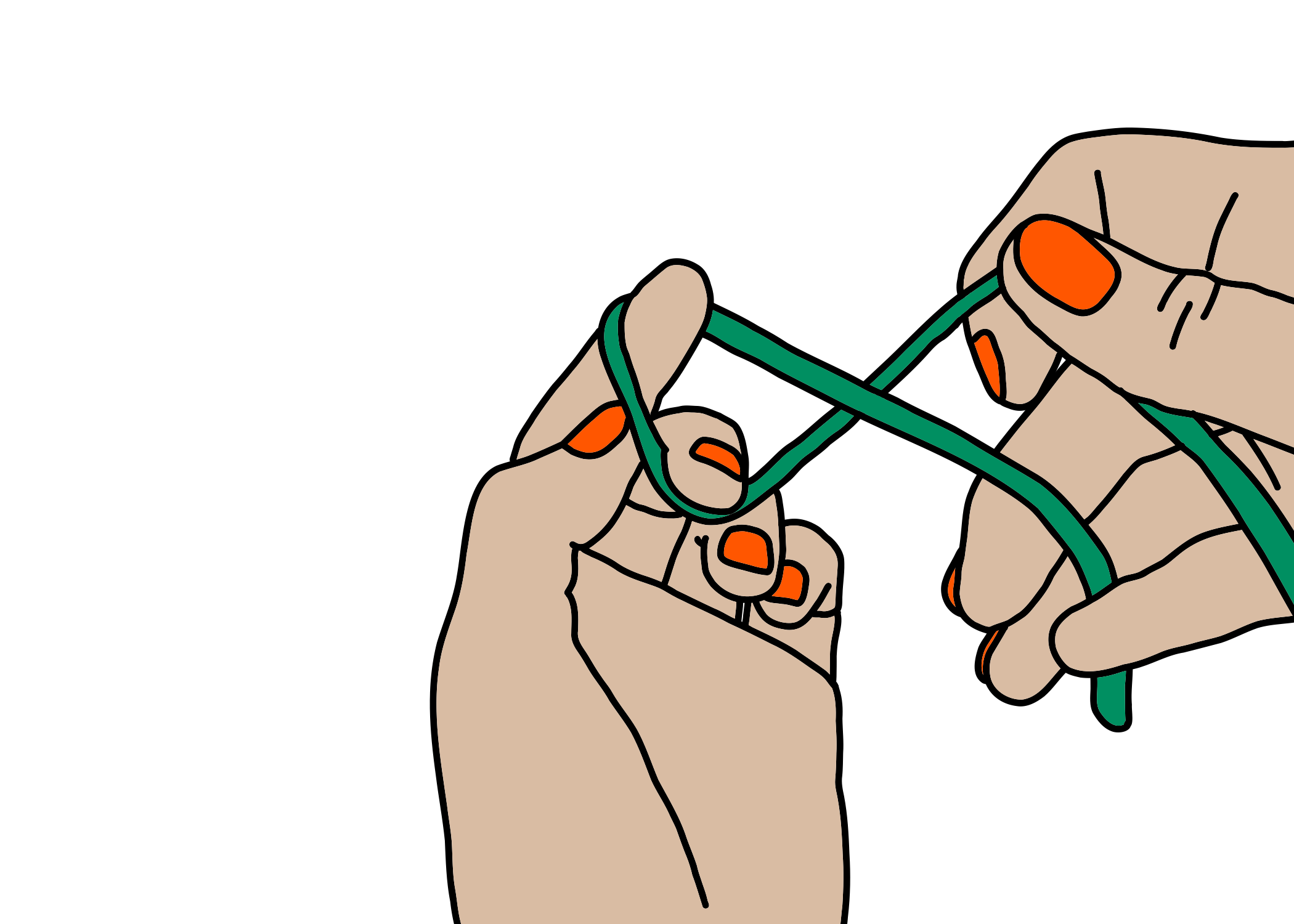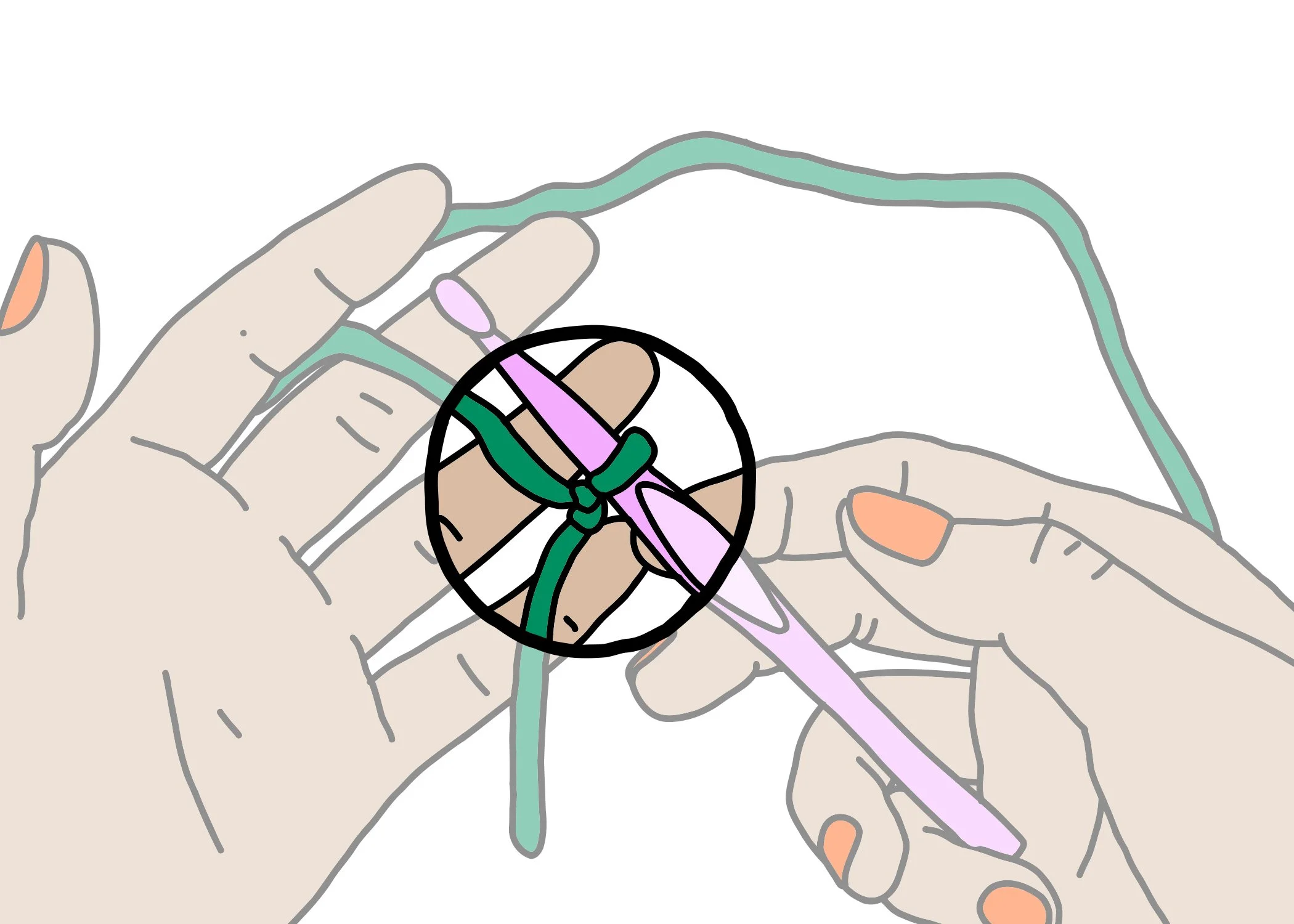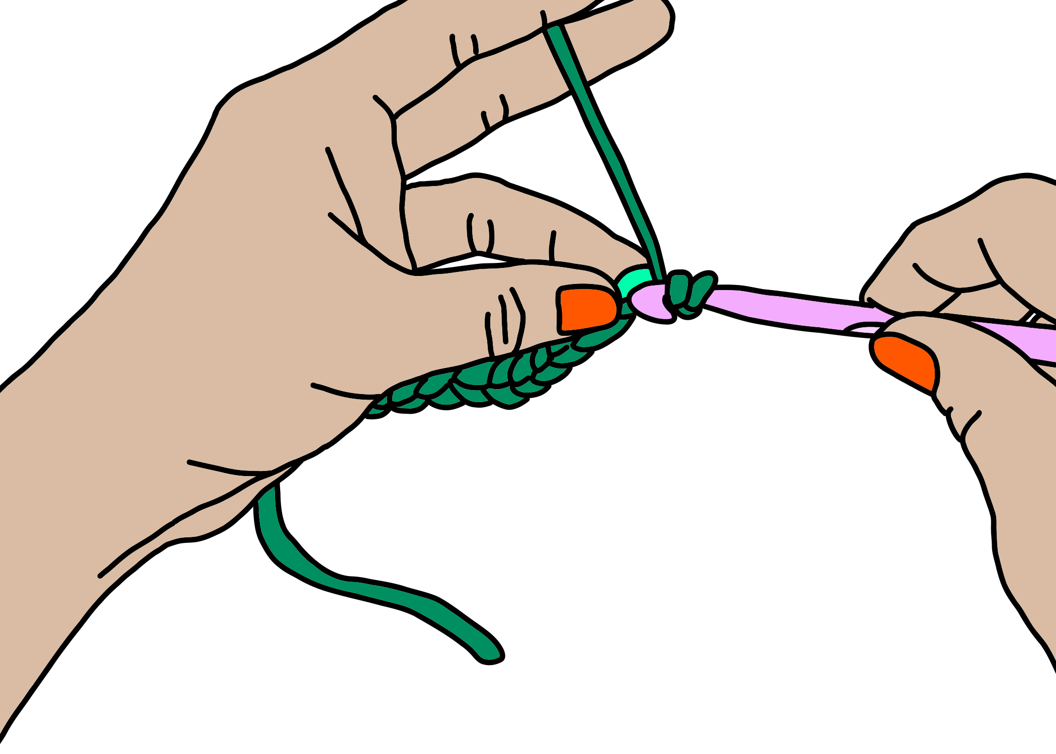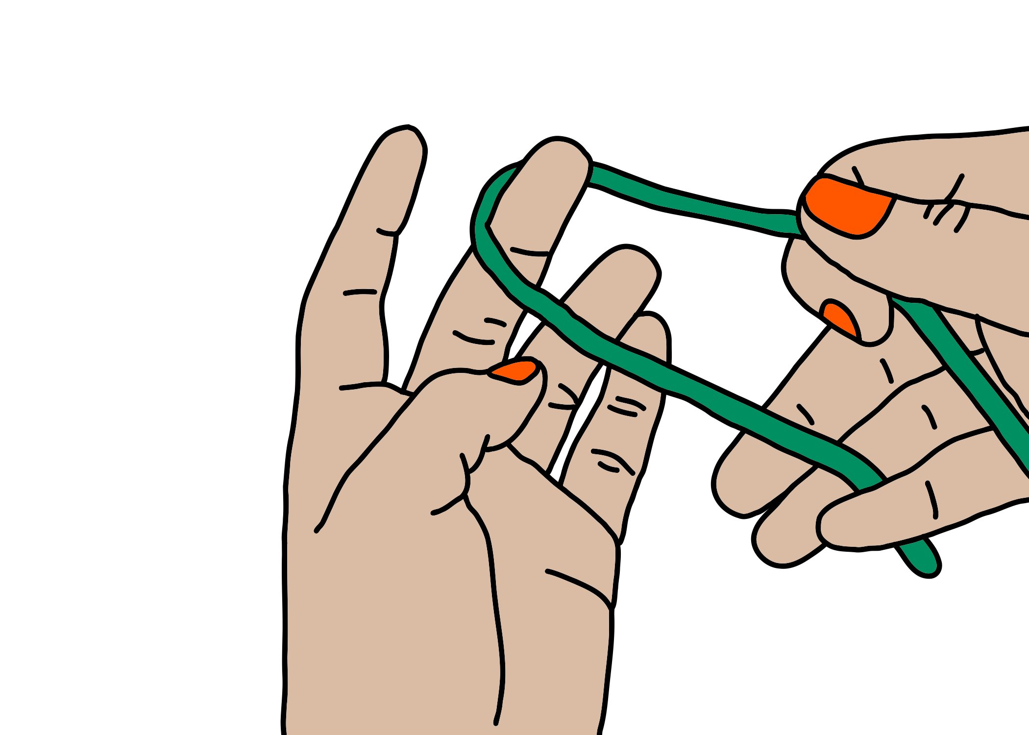 reach your thumb, middle-, and forefinger through the loop to grab the working yarn;
