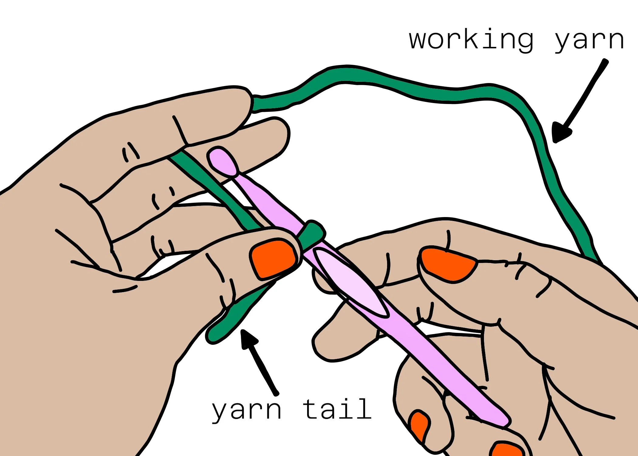Many crochet projects begin with a basic slip knot, which creates a little loop for your hook. Leave a few inches of a extra yarn at the end — that’s called the yarn tail.